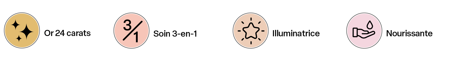 SOUPÇON D’OR : Connu pour ses propriétés antioxydantes, il aide à retenir l’humidité de la peau et maintient son hydratation. Il apporte un coup d’éclat subtil à la peau.